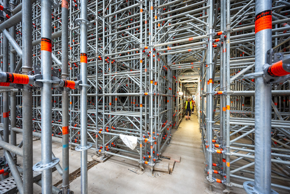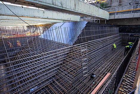 In den Bereichen, in denen die zweite Steifenlage bereits zurückgebaut ist, wurde das Traggerüst bis auf die Deckenhöhe von rund 11 Metern weitergebaut. Aktuell trägt das mehr als 1.000 Tonnen schwere Schwerlastgerüst das Eigengewicht der Stationsdecke. Nach ausreichender Erhärtung der Stationsdecken können das Traggerüst sowie die Umsteifungsebene in der Stationshalle abgebaut werden.