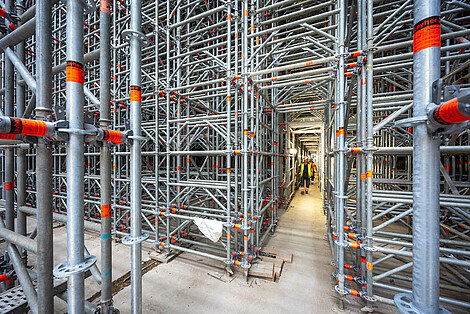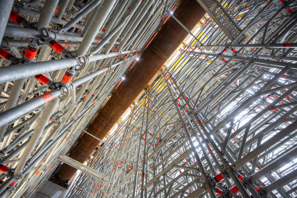 Mit dem Baufortschritt ändern sich auch die Aufgaben für den Gerüste-Wald in der Baugrube. Zunächst wurden die Traggerüste gebraucht, um die Steifen in rund 11 Metern Höhe über der Baugrubensohle zurückbauen zu können. Denn nur so können die zwischen 18 und 29 Meter langen, 1 Meter breiten und 1,70 Meter hohen Steifen sicher mit Seilsägen in Blöcke zerteilt und anschließend per Kran aus der Baugrube gehoben werden.