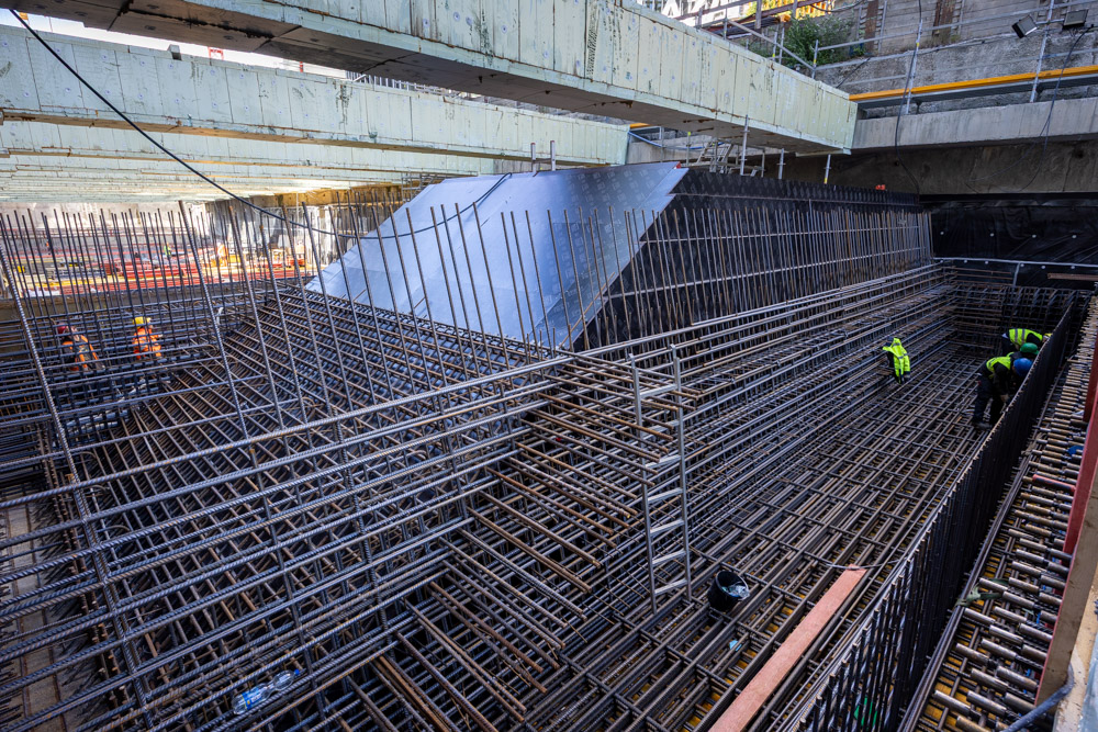 Die Station nimmt immer mehr Gestalt an, denn Mitte September wurde der erste Abschnitt der Stationsdecke betoniert. Insgesamt müssen 16 Abschnitte der 2,30 Meter mächtigen Decke hergestellt werden. Diese Arbeiten dauern voraussichtlich bis zum späten Frühjahr 2026.